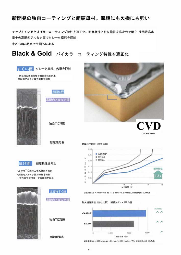 鋼加工用新CVDコーティング C115P:鋼の連続~軽断続切削 耐摩耗性・耐チッピング性重視 高効率加工用。 C125P:鋼の連続~強断続切削加工 高い汎用性有する鋼加工の第一推奨。 かつてない長寿命の実現へ。